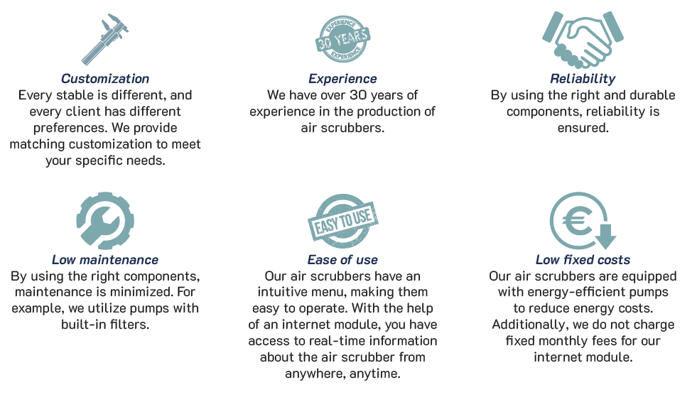 An air scrubber, as the name suggests, is an installation that purifies air. An air scrubber is used to reduce one or more substances that harm the environment. For VBV, creating an air scrubber isnothing new; our first biological air scrubber was built in 1986, long before air scrubbers gained prominence in the agricultural sector. With over 30 years of experience in air scrubber construction, our company possesses extensive knowledge of plastics, electrical systems, and climate control. Over time, the design of the air scrubbers has been extensively optimized. One of the most important aspects is the customization that we provide. Each installation has a different design, and every customer has their own preferences. With the customization we provide supported by our knowledge, your wishes can be realized. And you will enjoy it every day.
